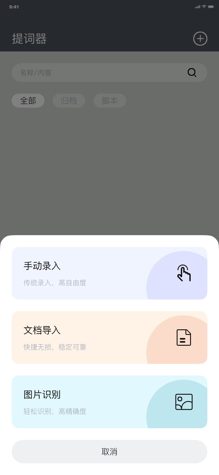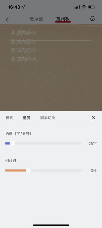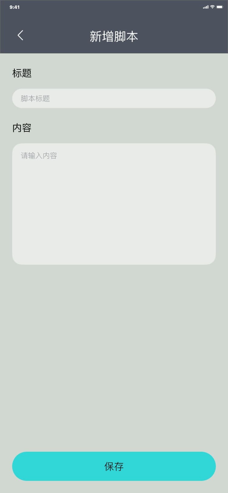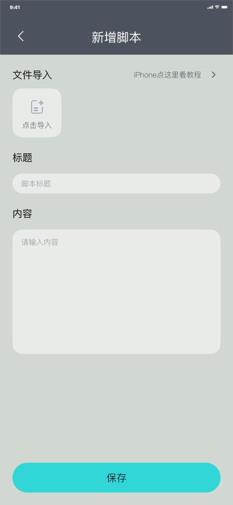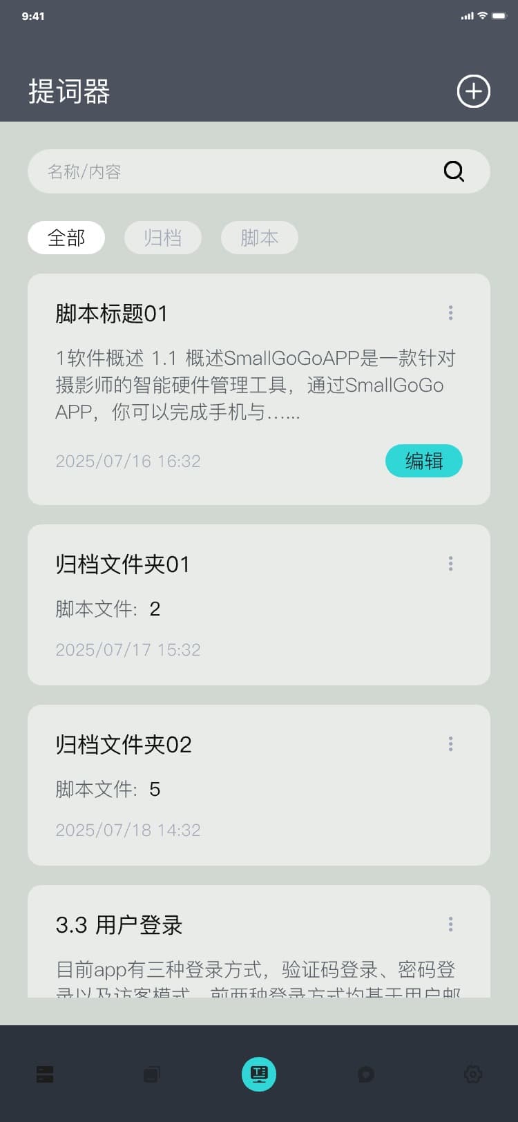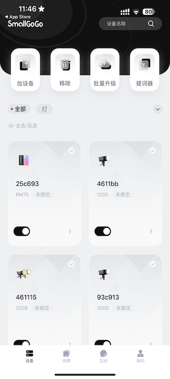4) 通过底部菜单切换流程:场景页(提词器)(互动页)(设置页) → 点击底部菜单第一个图标 → 设备页,界面如图: