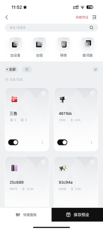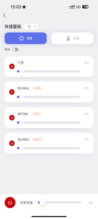 14) 用户可以通过场景-快捷面板快速调整场景内所有设备与设备组亮度与色温参数;