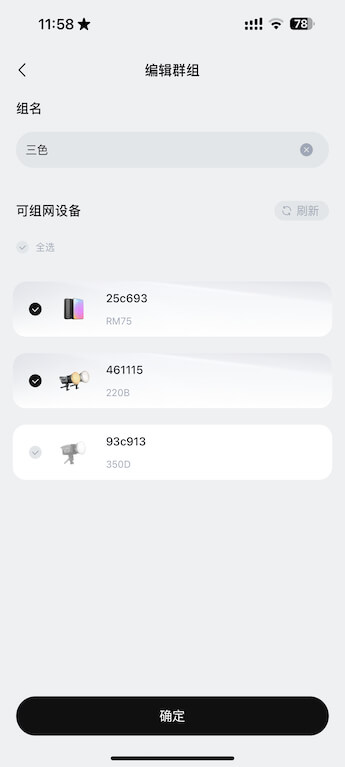 1) 添加设备(补光灯)流程:设备页 → 点击顶部菜单“补光灯”→ 点击“加设备”→ 加设备页 → 勾选“可组网设备”列表后的复选框 → 点击“确定” →