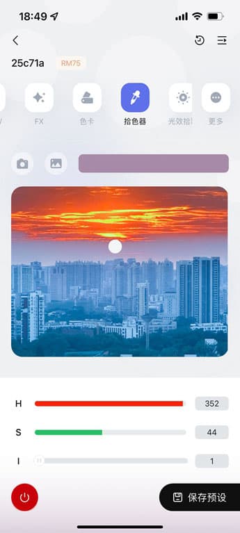 :就是拾取颜色的器具,此系统中,用户可拍照上传照片,也可以直接访问手机相册选择照片上传,照片上传后,用户可在已上传的照片拖动取色器,进行取色操作,所获取的颜色会自动同步到设备上去。