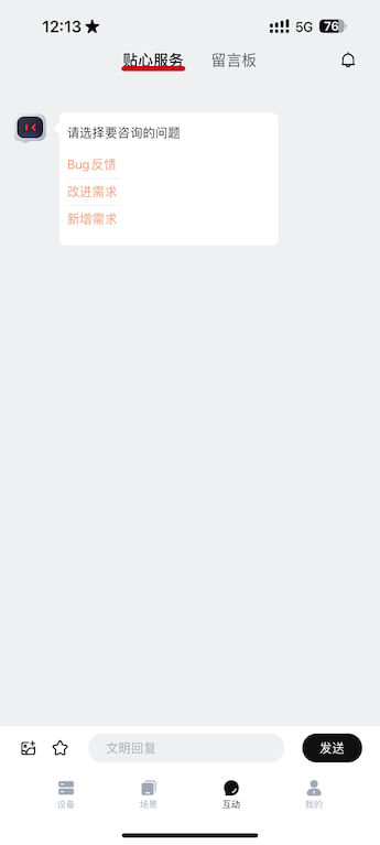 切换留言分类流程:互动_留言板页 → 点击类型标签“Bug反馈”/“改进需求”/“新增需求”,界面如图: