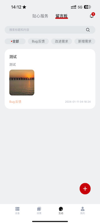添加留言流程:互动_留言板页 → 点击“+” → 留言页 → 选择分类 → 输入标题与内容 → 上传图片(可跳过此步) → 点击“提交” → 互动_留言板页(列表新增一条数据),界面如图: