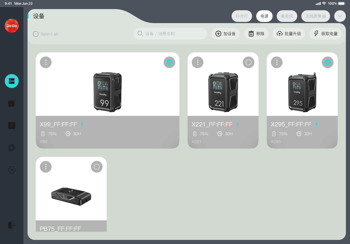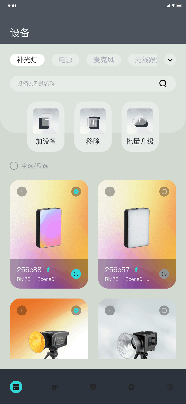 用户可批量添加摄影智能设备,集中管理 (目前以SmallRig 智能摄影补光灯为主)