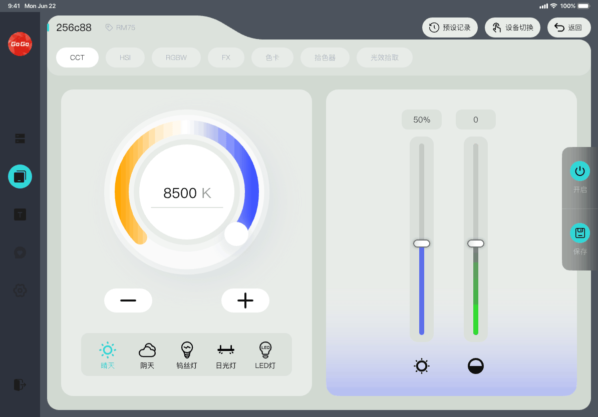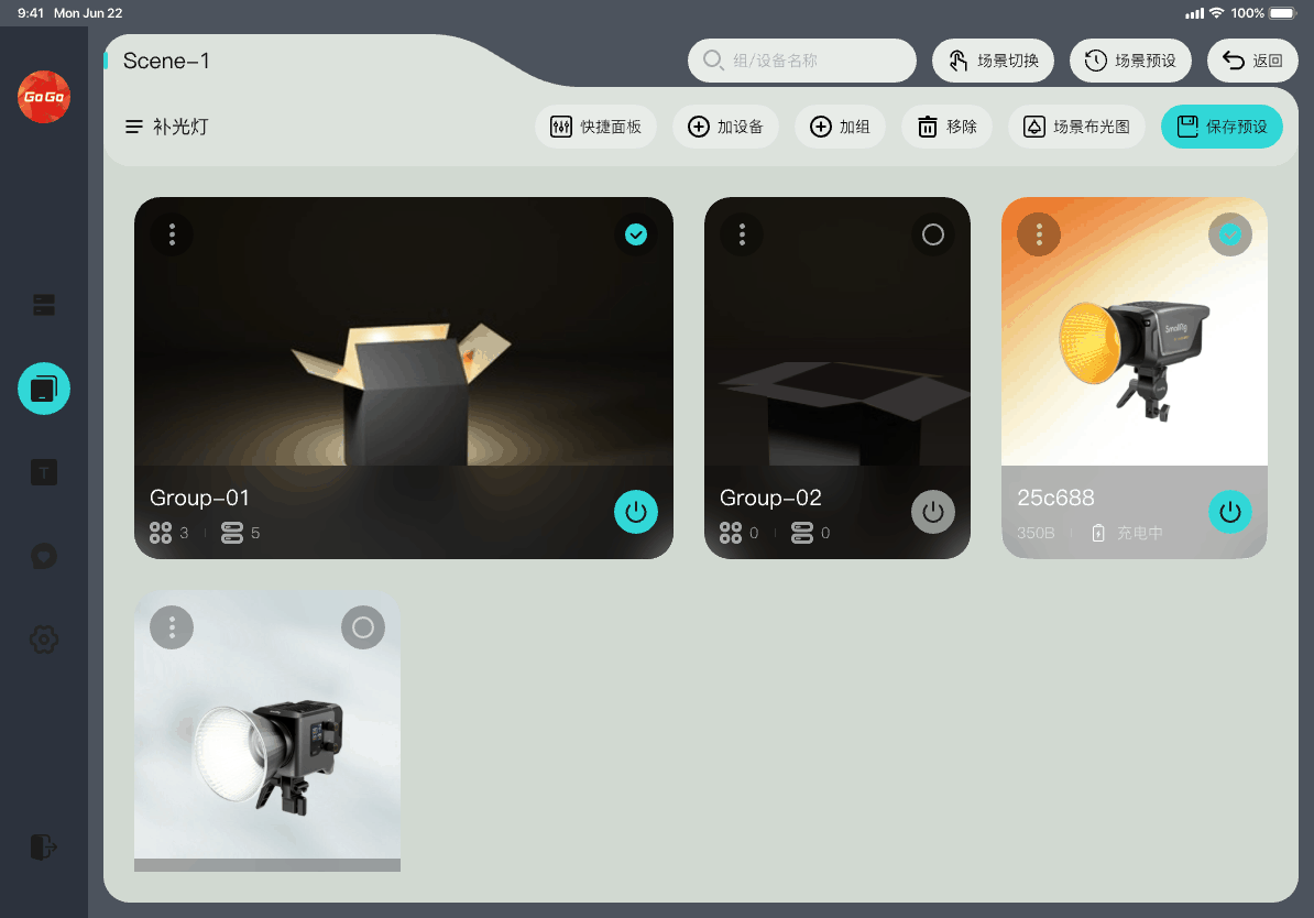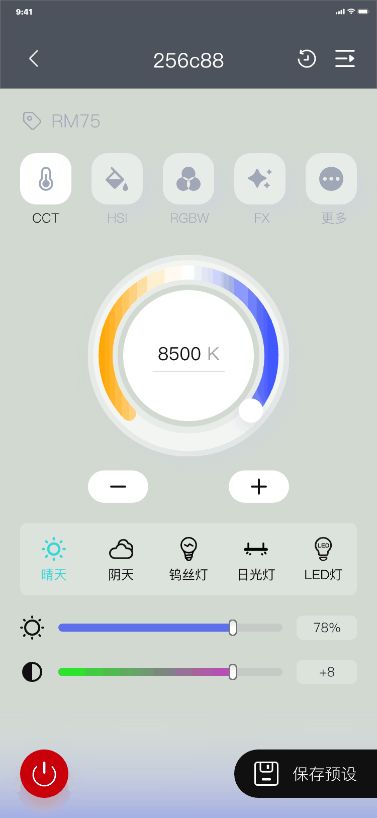 注意:从具体场景(组)点击进入控制页,默认会显示补光灯类控制页,且控制页内容会以功能最多的界面为显示界面,例如:RM75有7个控制功能,120B有两个控制功能,从具体场景_组点击进入控制页后,控制页内容会以RM75的控制界面为基础当做组级控制内容显示。